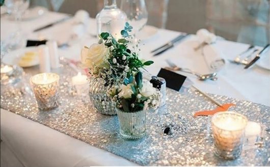 Le chemin de table à séquin argenté sûblimera vos tables de réception par ses scintillements. Le rendu est glamour et amène une tendance chic quelque soit votre évènement.